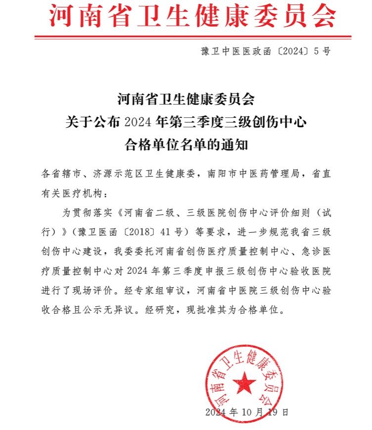 本网讯(文/李永亮)2024年10月19日,二附院顺利通过省级三级创伤中心验收,成为河南省第一家成功通过评审的省直三级综合中医院。这一里程碑式的成就,标志着医院学科建设再结新硕果,在创伤救治领域迈出了坚实的一步。