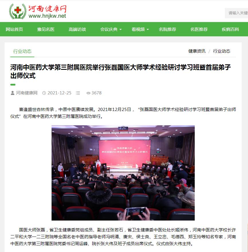 编者按:2021年12月25日,河南卫视、河南日报客户端、河南新闻广播、医药卫生报、郑州日报、大河健康报等多家媒体对三附院举行“张磊国医大师学术经验研讨学习班暨首届弟子出师仪式”进行报道,现将相关报道刊发如下: